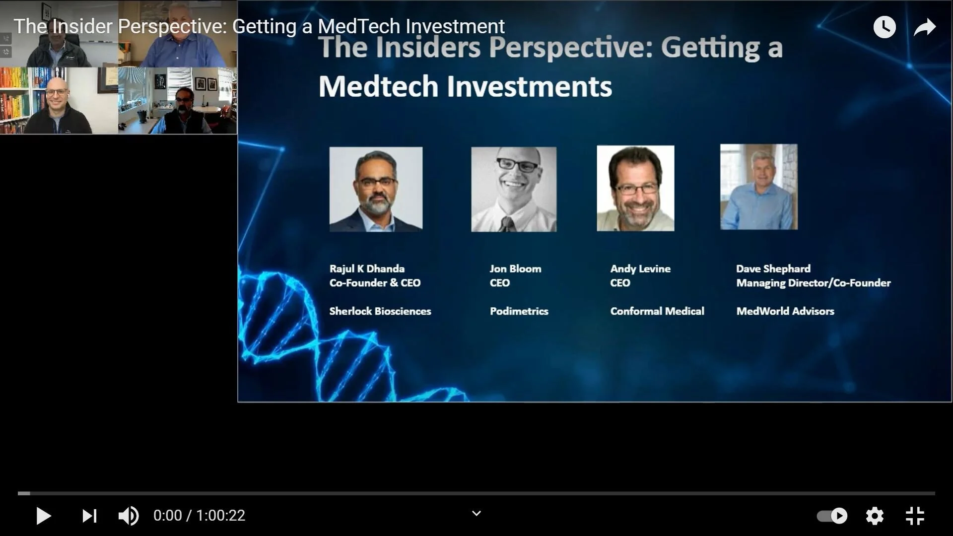 In a webinar hosted by MassMEDIC, MedWorld Advisors Co-Founder and Managing Director Dave Sheppard is joined by three medtech CEOs to discuss the topic of raising money. Jon Bloom, CEO of Podimetrics, Rahul Dhanda, Co-Founder and CEO of Sherlock Biosciences and Andy Levine, CEO of Conformal Medical share their inside perspective on the do's and don'ts of getting investments in the medtech sector.